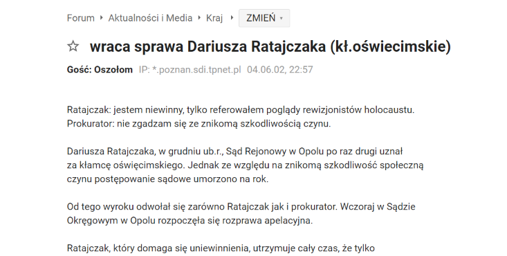 za kłamcę oświęcimskiego. Jednak ze względu na znikomą szkodliwość społeczną